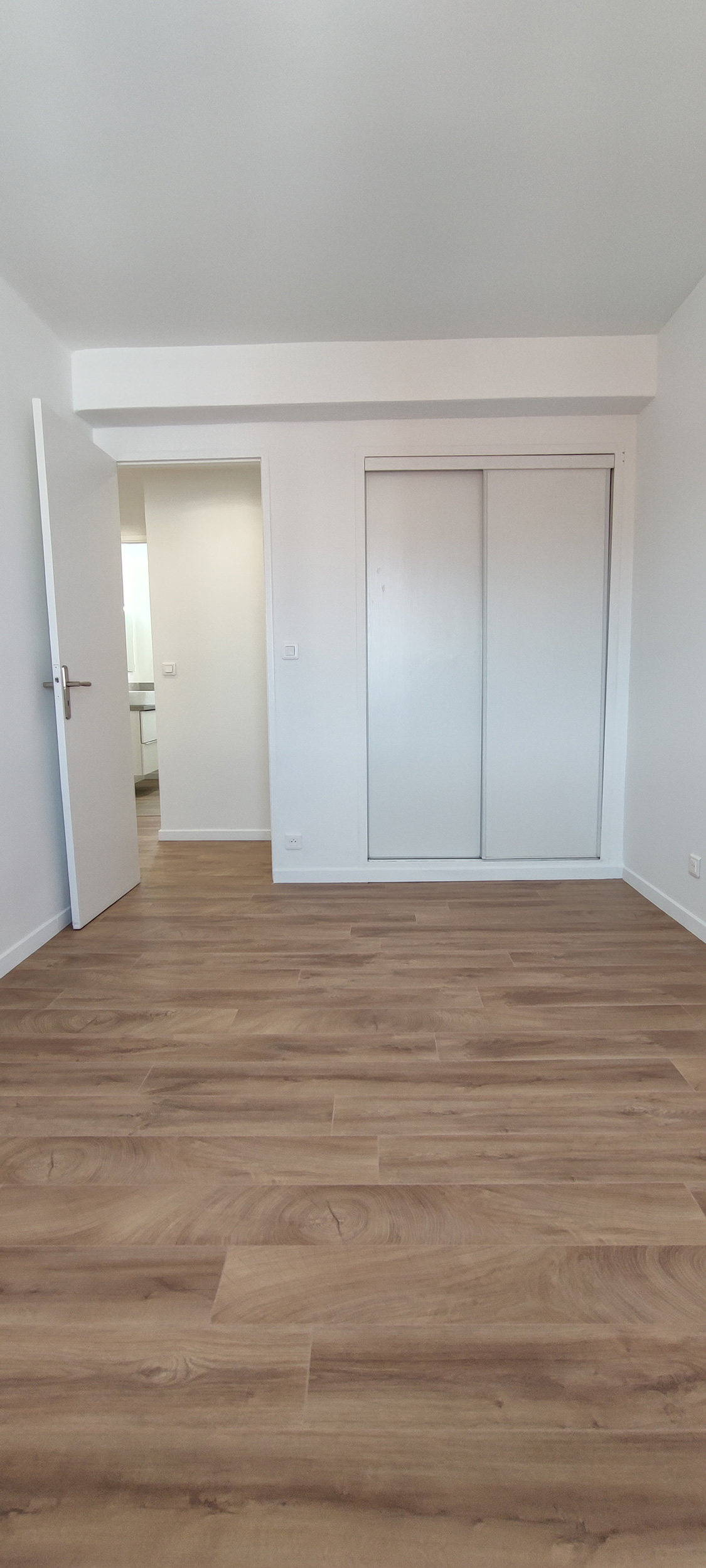 Un sol harmonieux est assuré avec un carrelage imitation bois et un parquet chaleureux recouvrant tout l'appartement.