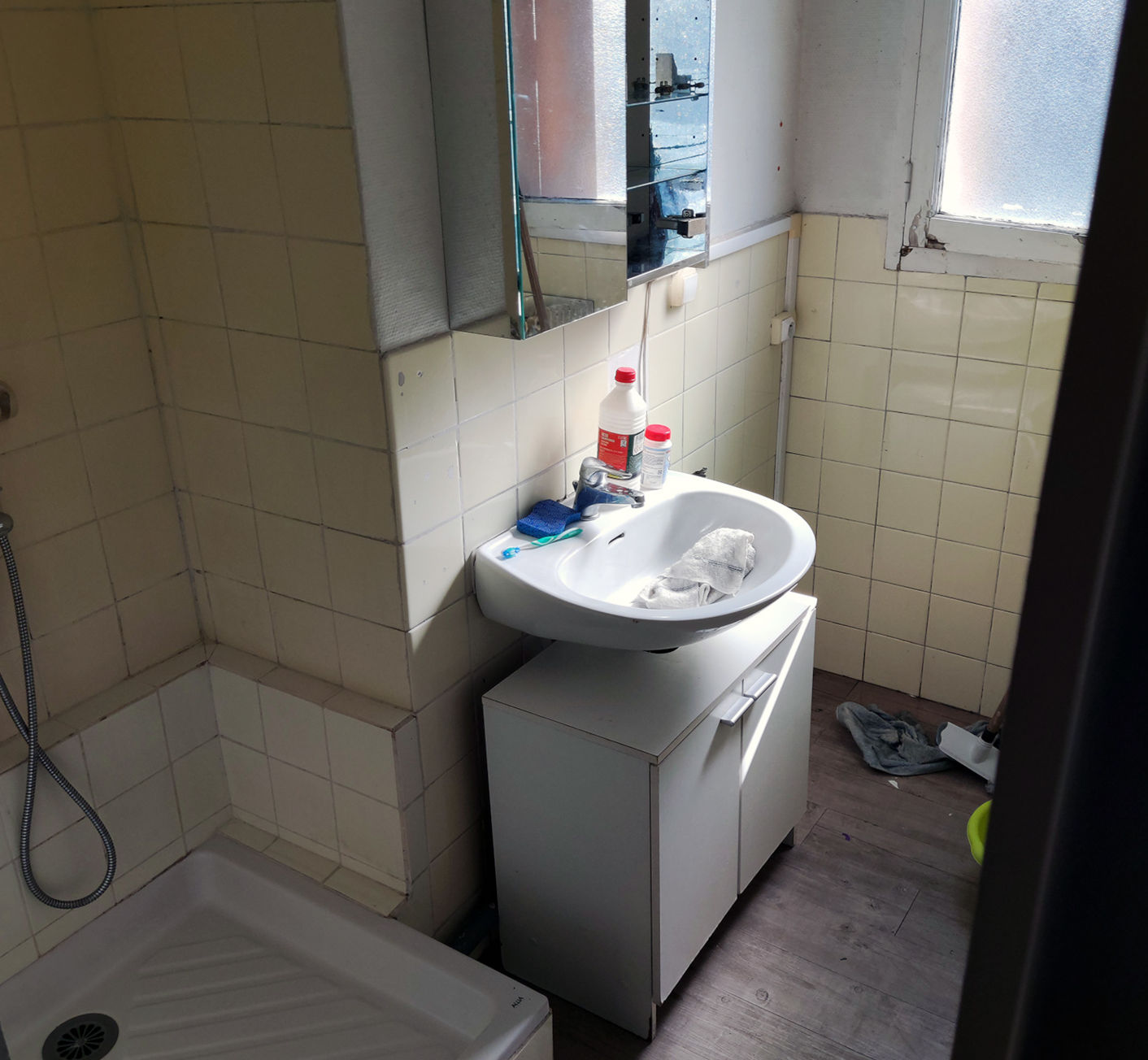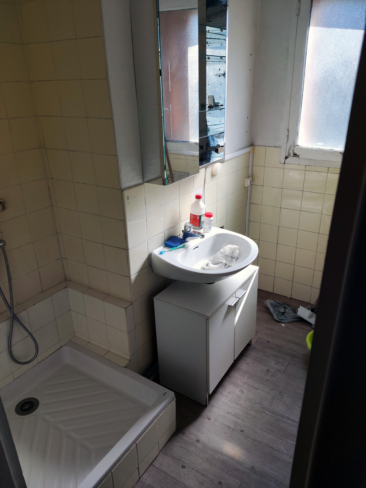 Nous avons abbatu la cloison pour révéler tout le potentiel du grand double séjour. La salle de bain a été optimisé avec une douche extra plate, des rangement et un grand miroir aggrandissant la pièce. Une cuisine en L a entièrement été repensé pour faire la part belle aux rangements et l'accessibilité.