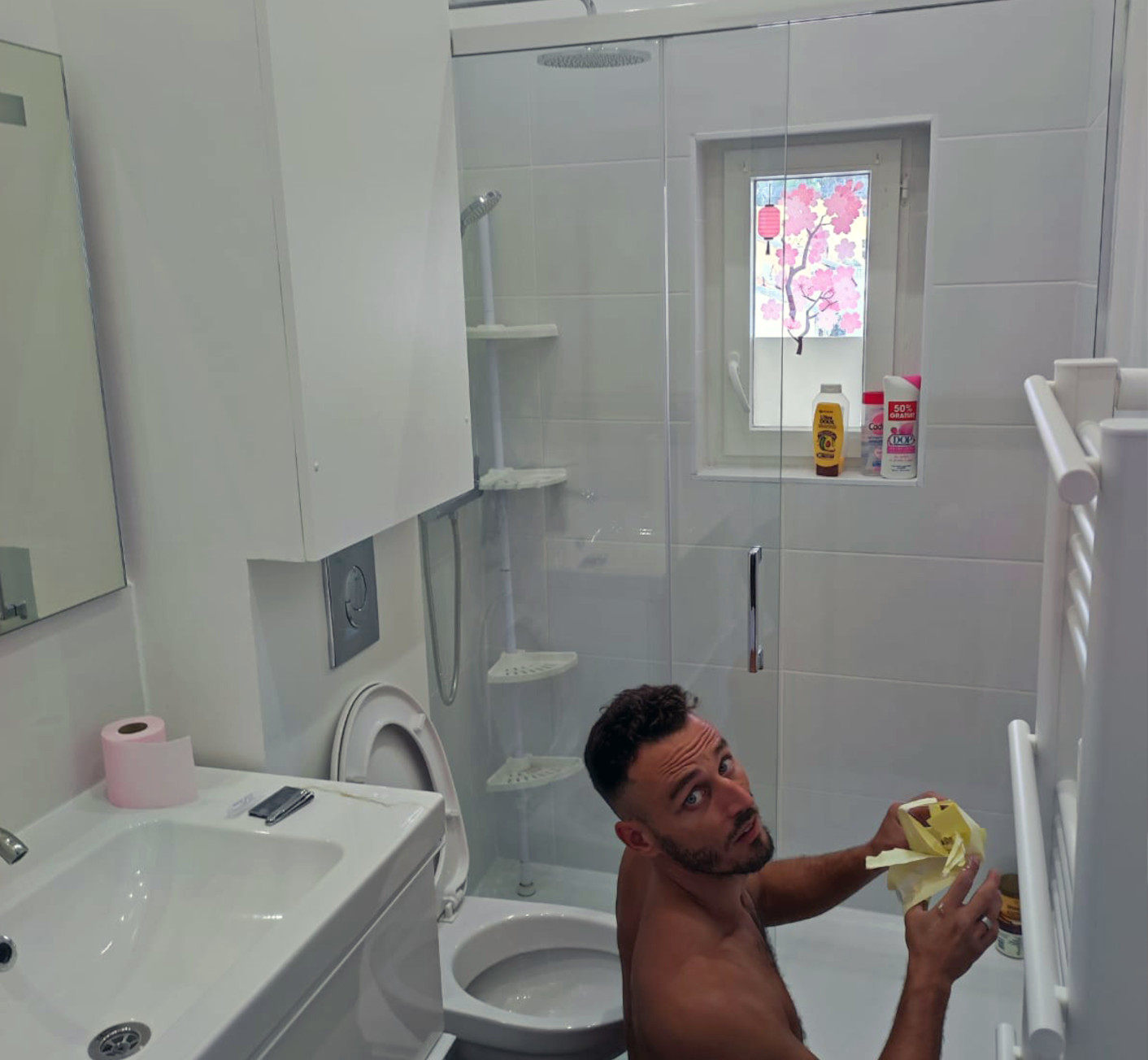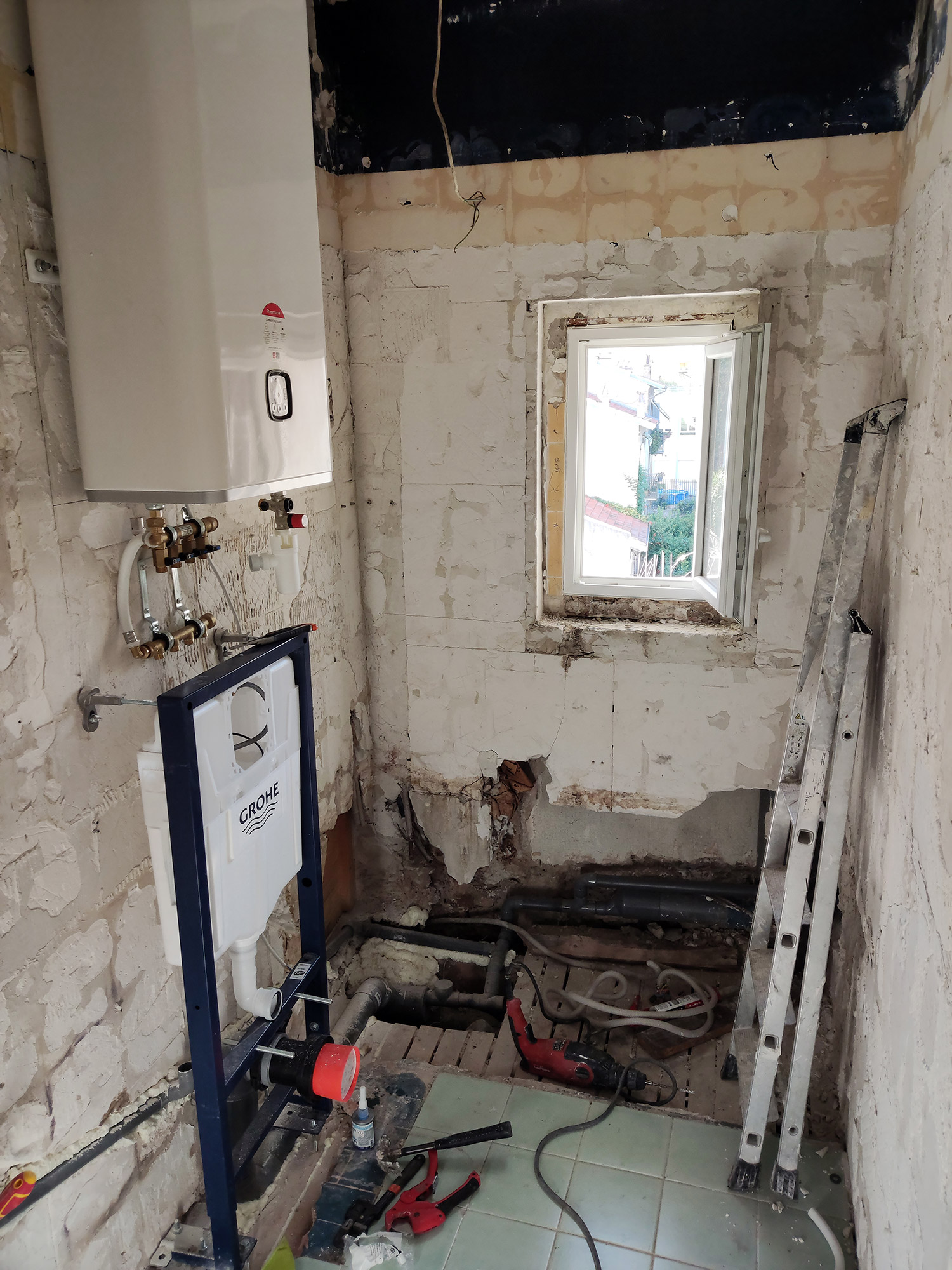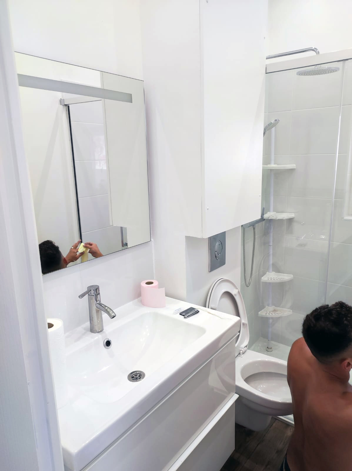 La salle de bain se renouvelle d'un blanc éclatant avec un nouveau réseau d'eau en multicouche et son chauffe-eau extra plat dissimulé au dessus d'un wc suspendu, une grande douche extra plate et de nombreux rangements.