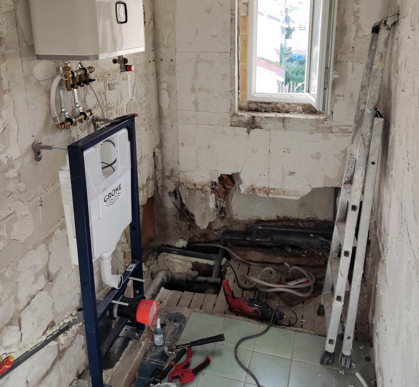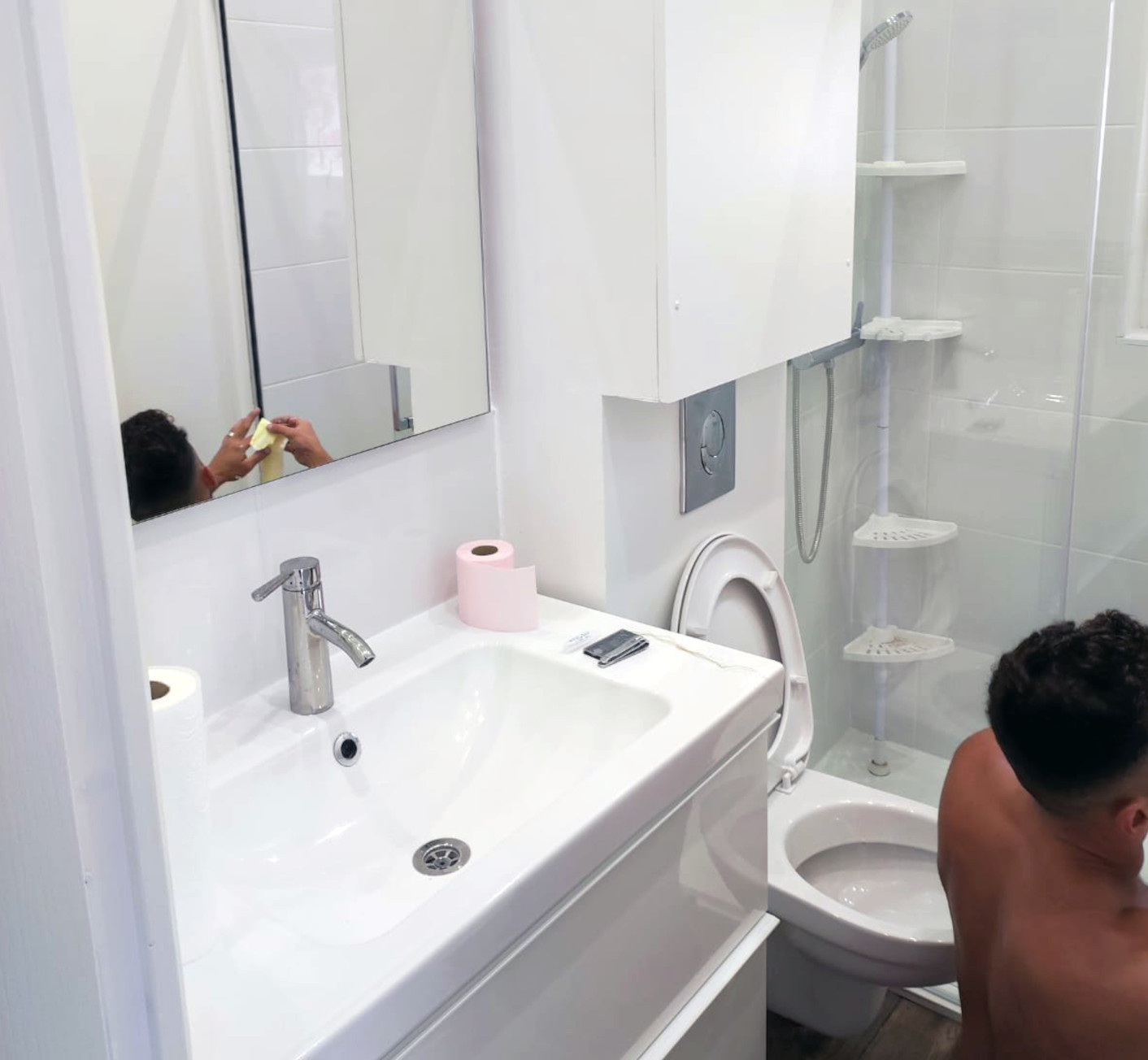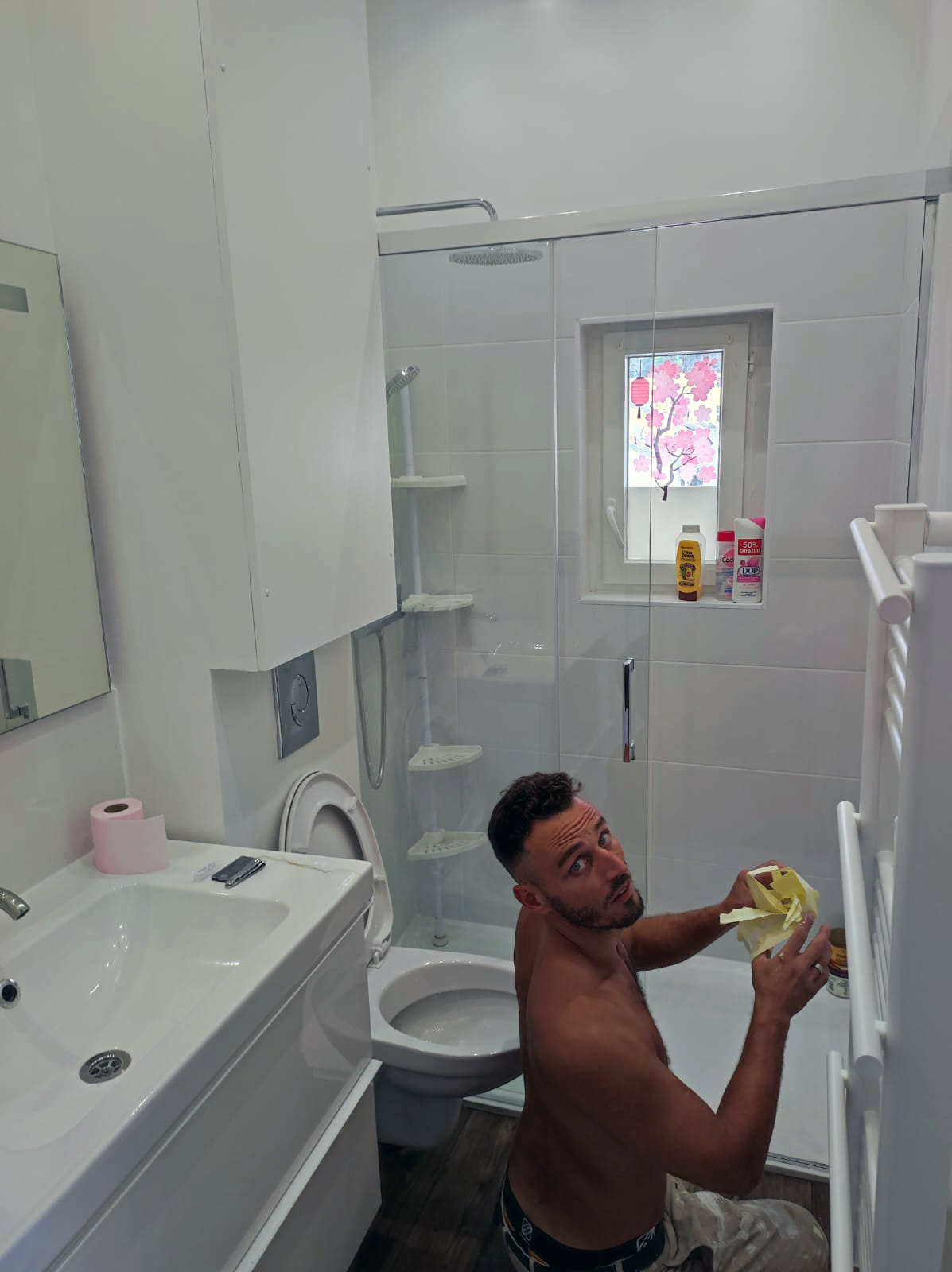 La salle de bain se renouvelle d'un blanc éclatant avec un nouveau réseau d'eau en multicouche et son chauffe-eau extra plat dissimulé au dessus d'un wc suspendu, une grande douche extra plate et de nombreux rangements.