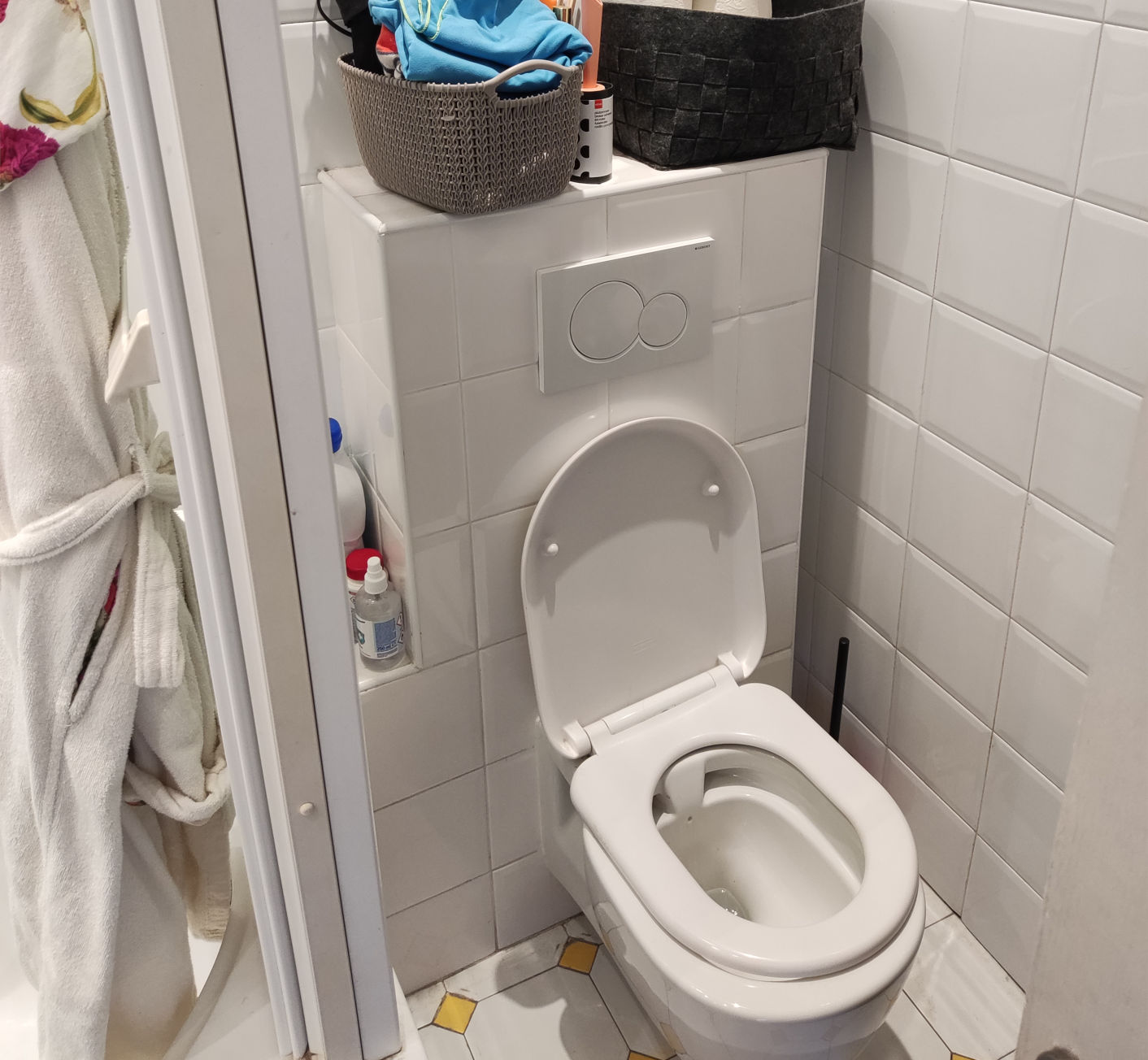 Objectif modernité et espace rangement. Transformation complète de la salle de bain de la chambre parentale pour y accueillir un grand placard de rangement sur mesure, un nouveau réseau d'eau en multicouche avec chauffe-eau extra plat et une nouvelle pièce avec un deuxième toilette.