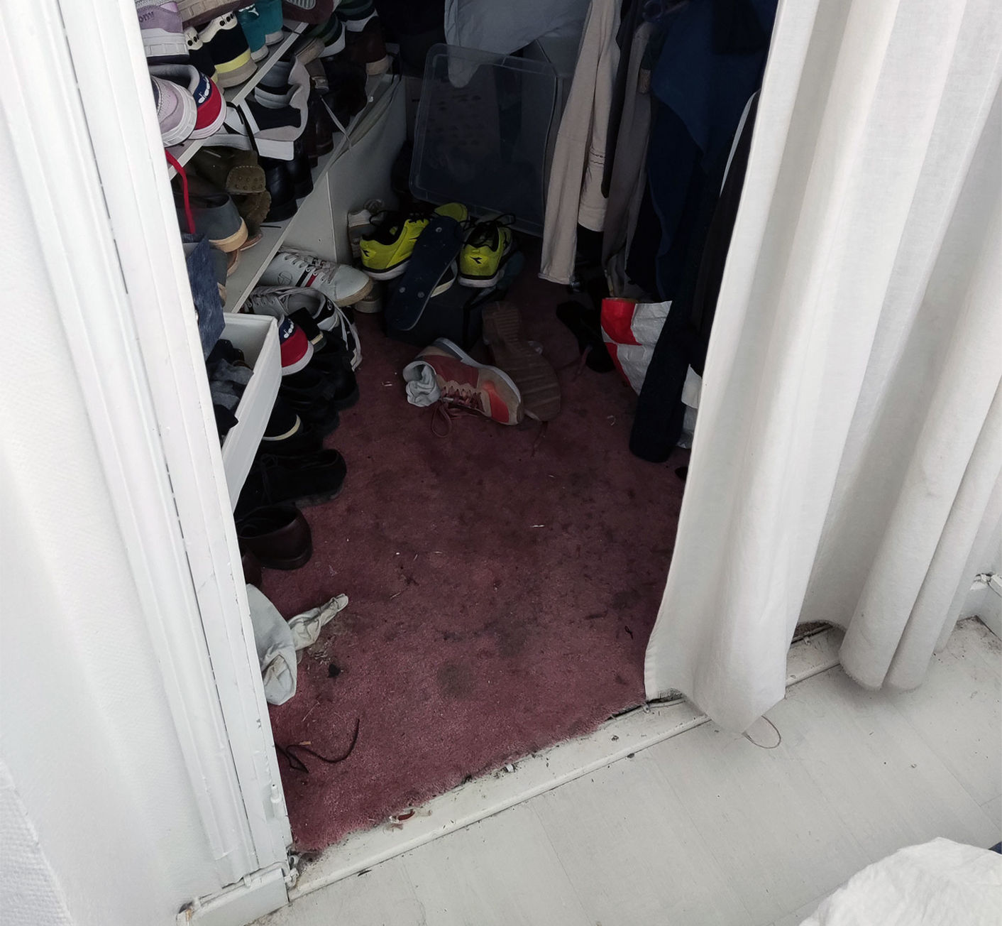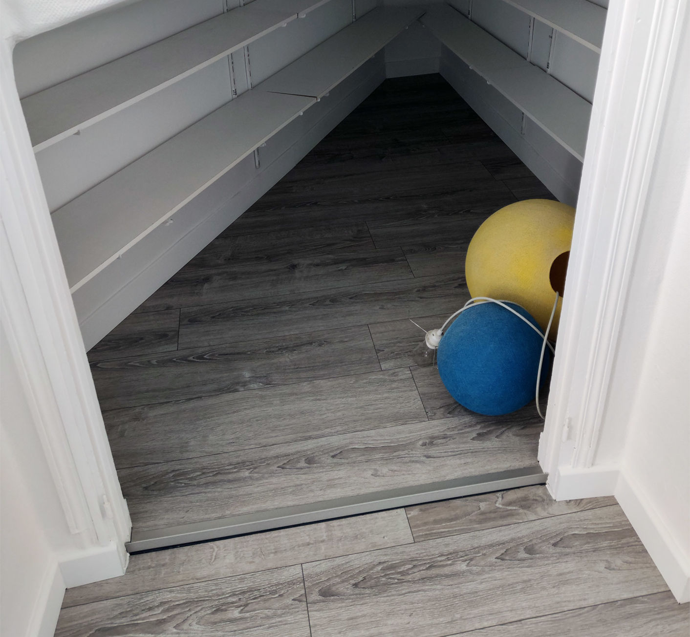 Côté confort, deux placards sur mesure et un parquet rustique chaleureux apporte la touche finale à la chambre.